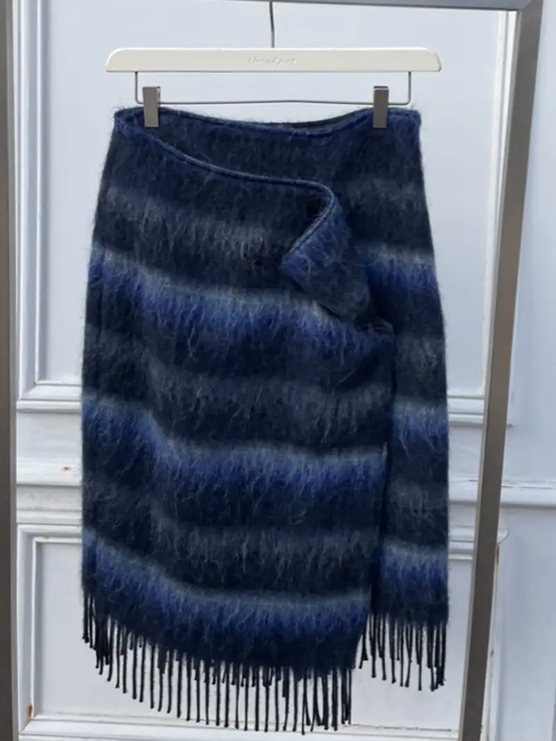 Sa coupe faux portefeuille asymétrique structure la silhouette avec modernité, tandis que les franges délicates dynamisent le mouvement et apportent du caractère à la pièce.