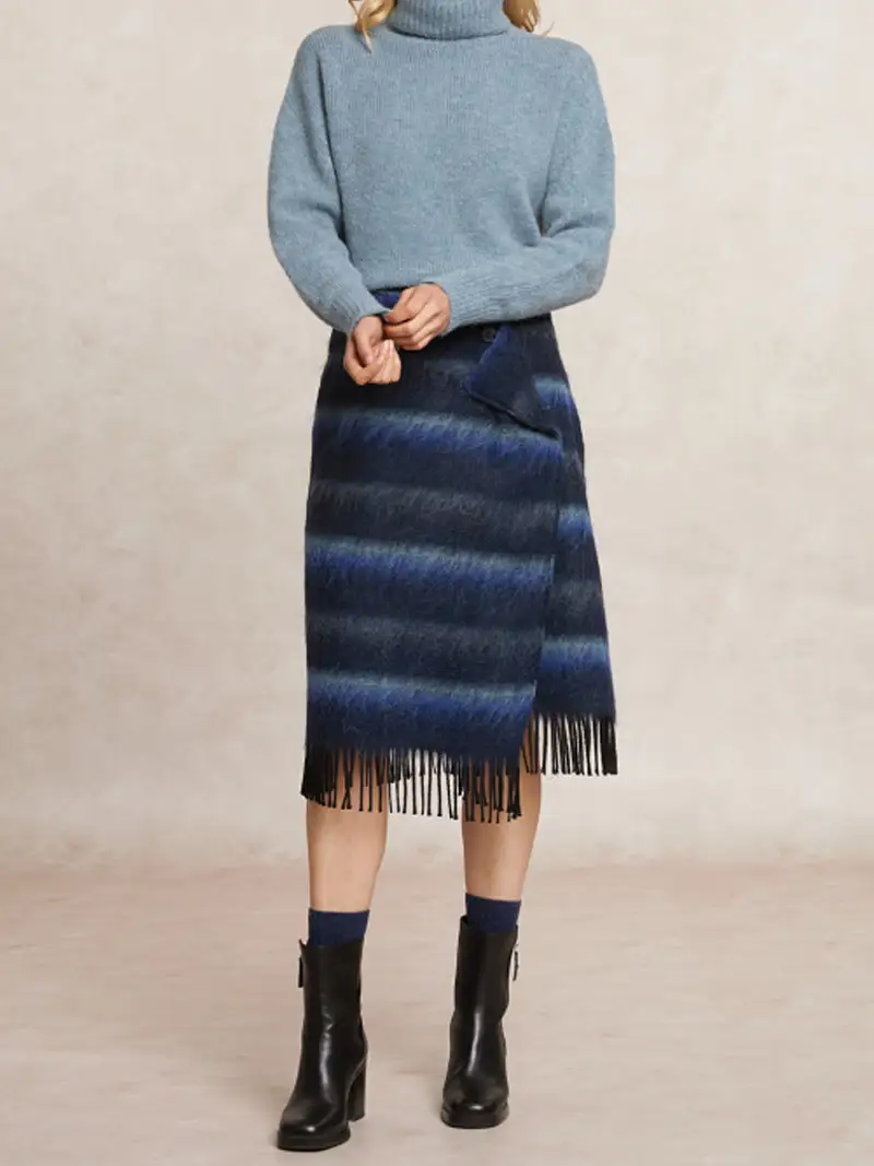 Chic et originale, la jupe Jane signée RIVERWOODS séduit par sa coupe faux portefeuille asymétrique et ses finitions frangées.