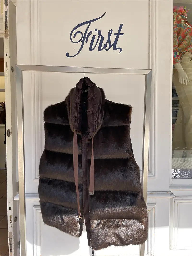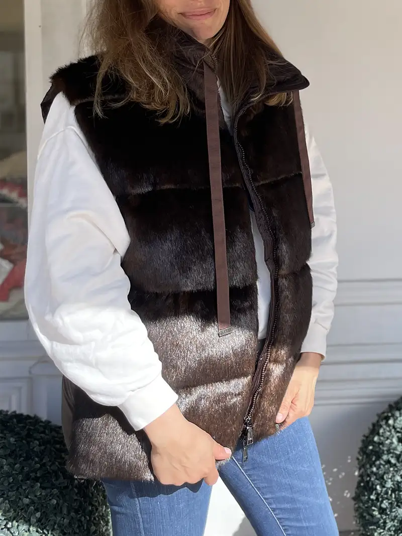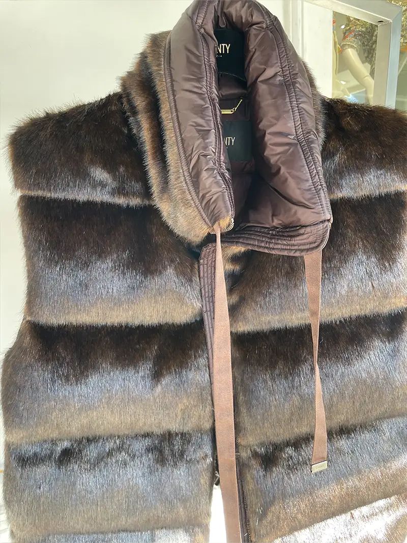 Son design sans manches permet une superposition facile sur un pull ou une maille épaisse. La fourrure synthétique sur le devant apporte texture et caractère, tandis que le col resserrable par lien permet d’adapter le volume selon vos envies.