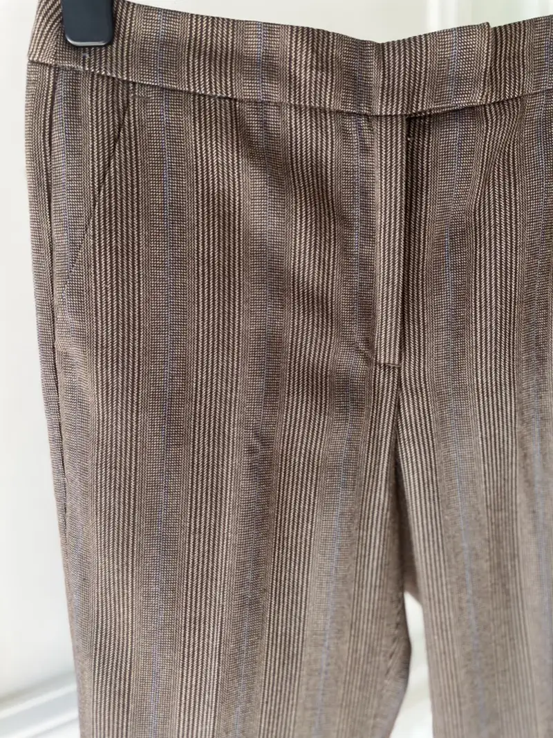 Son motif chevron marron, rehaussé d’une fine rayure bleue, crée un contraste subtil et sophistiqué. Les poches cavalières complètent la finition avec élégance et praticité.