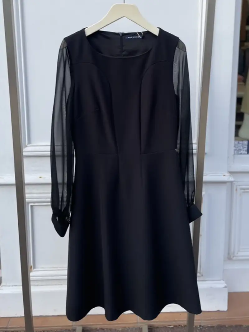 Sa coupe droite structure la silhouette avec sobriété, tandis que ses manches en voile léger apportent contraste et subtilité. La fermeture éclair au dos assure un ajustement net et confortable.